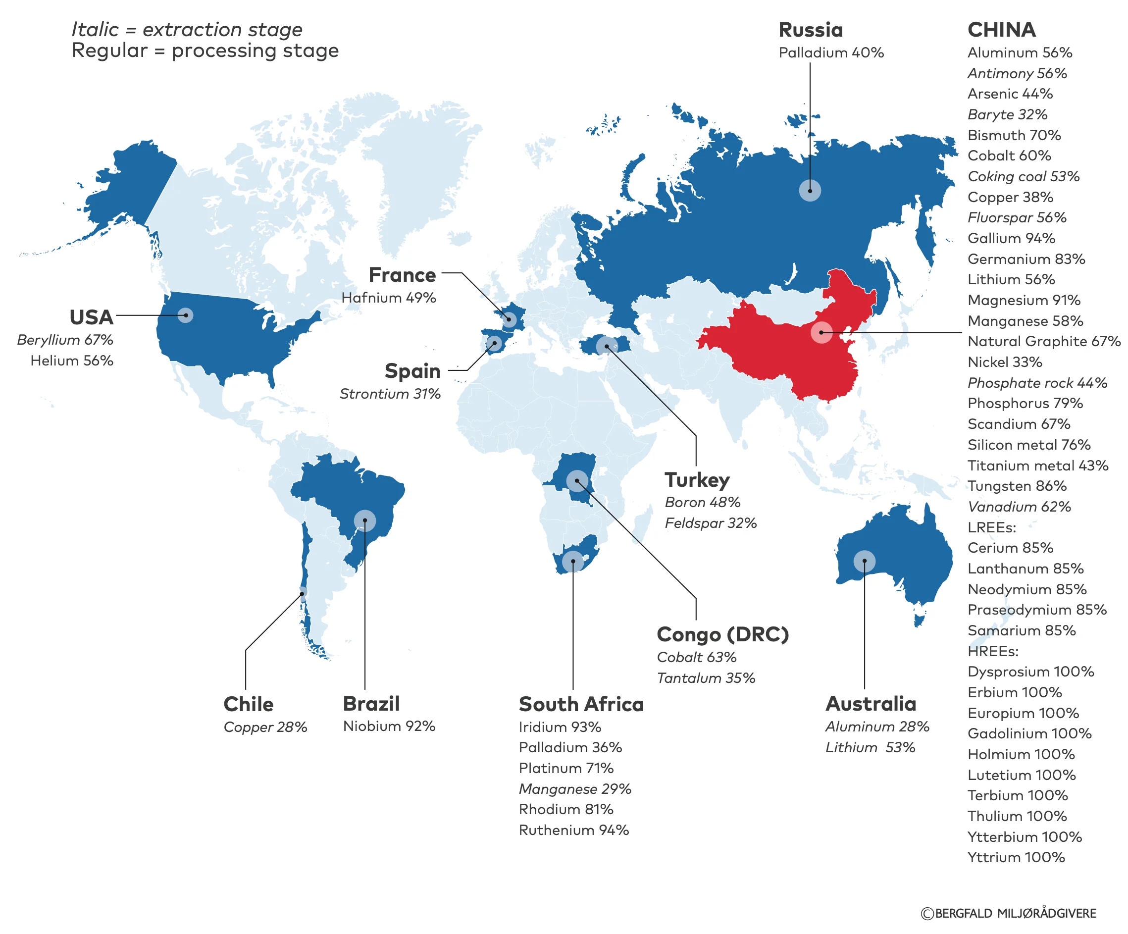 Asta pentru că ele conțin minerale importante care se găsesc doar în anumite locuri pe glob, de unde se extrag, iar apoi se procesează în la fel de puține țări. Disponibilitatea acestor substanțe este la fel de limitată, iar impactul lor de mediu și uman e puternic. Uite aici o vizualizare a principalilor furnizori globali de minerale critice (îi poți număra pe degete):