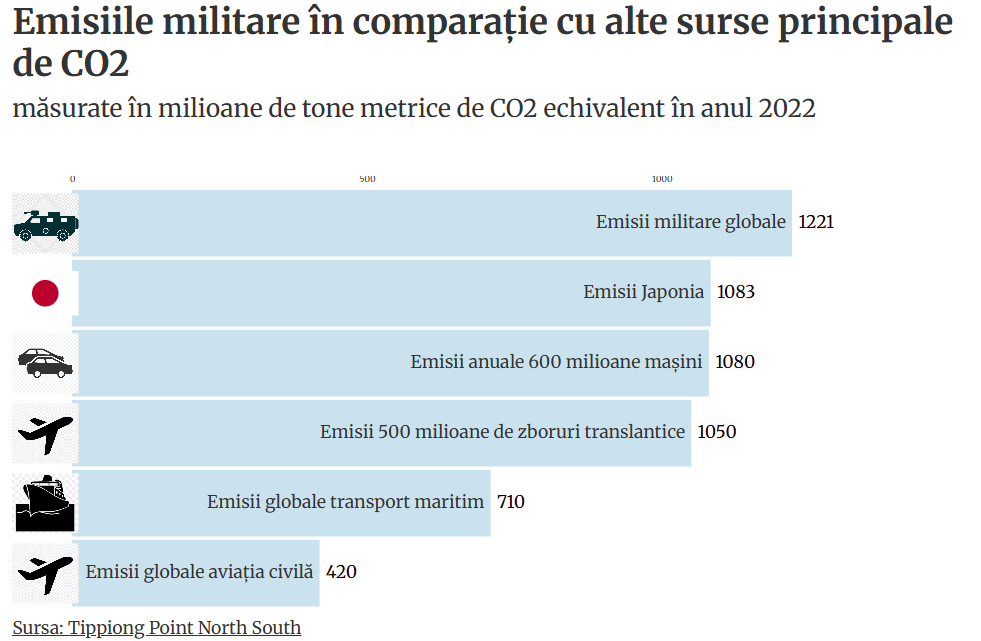 Armatele globale și industriile de armament produc minim 5,5% din totalul emisiilor de carbon. Prin comparație, aviația civilă reprezintă 2% din emisiile globale de gaze cu efect de seră. Iar procentele sunt estimate din puținele date pe care le avem, pentru că nicio țară nu e obligată să raporteze emisiile militare.